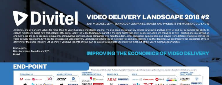 At IBC2018 we presented the fifth – and 2018’s final – edition of the Video Delivery Landscape. It joins a line of posters that have been downloaded over 10.000 times and can be found on office walls across the globe. We have updated this overview with new companies, brands and products in different categories within video delivery tech. You will find the world’s most important DRM-suppliers, video players, video processors and more.